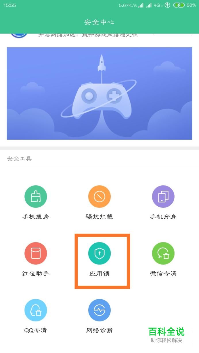 屏幕向上滑,然后在倒数第二列的“安全工具”里面可以看到“应用锁”,点击进入。