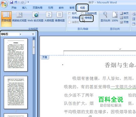 快速到达某页 在Word 2007中打开文档,单击“视图”选项卡,在“显示/隐藏”组中把“缩略图”项勾选上,这时窗口左侧会出现一列文档各页内容的缩略图(见图1)。接下来拖动左侧缩略图栏中的滚动条,找到准备要查看、修改的那页的缩略图并单击它,就能快速到达你所指定的页了。