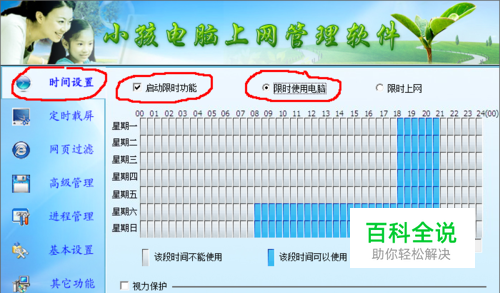 点击左上角的“系统设置”按钮,进入软件的设置界面。 1,点击“时间设置”选项卡。 2,勾上“启动限时功能”。 3,选择“限时使用电脑”。 然后在下方的时间二维表格中通过点击的方式设置哪些时间是可以使用电脑的,哪些时间是禁止使用电脑的。下图中设置的就是允许其在周一至周五的18:00-21:00允许其使用电脑,周六周日的08:00-21:00允许其使用电脑,其它时间均禁止其使用电脑。当然下面设置中允许其使用电脑的时间比较多,通常我们自己在设置的时候一般不应该让其使用这么久的电脑。