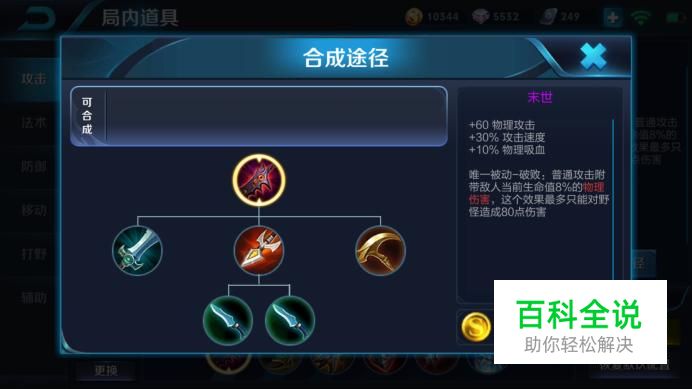 首先介绍一下装备,末世,中前期装备,增加60物理攻击,30%攻击速度,10%物理吸血,唯一被动会对普通攻击附带目标当前生命值的8%的物理伤害,金币2160,价格较便宜,可以选择成为射手第一件攻击装备。