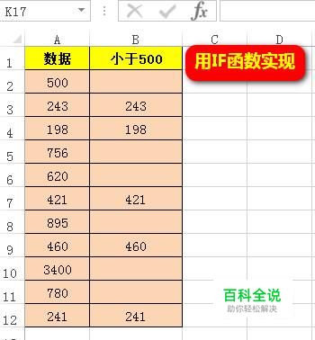 那么,我们就可以用IF函数来实现。 在B2单元格输入公式:=IF(A2<500,A2,"") 公式解释:IF(A2<500,A2,"")中的IF是条件函数,此公式的意思是,当A2单元格的数值小于500时,就显示在A2单元格的数值,否则显示为空。