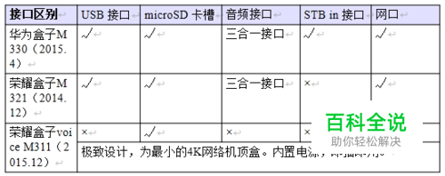 接口区别: 荣耀盒子voice M311 只有 microSD 卡槽和HDMI输入,荣耀盒子M321和华为盒子M330具有 USB 接口、AV 接口、网口, 可以连接扩展更多设备。