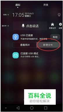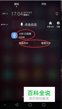 确认手机的连接模式是否正常 连接电脑后,查看手机通知栏,未选定则为充电模式。此时手机只能充电,不能完成连接操作。选择管理文件或者查看照片方可与电脑连接。
