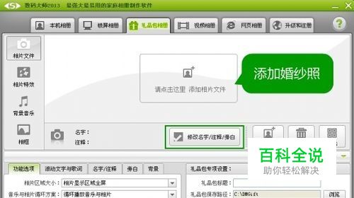 导入婚礼照片,记录爱情历程 数码大师被称为人人都会用精美相册制作软件,我们可以制作本机相册、视频相册、礼品包相册等。制作电子请柬,那使用的是“礼品包相册”功能的。如下图所示,点击相片列表中部的大按钮,可以将你们的婚纱照片、生活照等导入软件的。点击“修改名字/注释/旁白”按钮,为相片写下名字和注释,你也可以发挥自己的文采,写下一段旁白,详细记录爱情的甜蜜历程。
