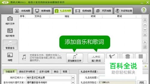 制作有声有色的结婚请柬,插入动感歌词字幕 接着我们就来为相册添加动听的背景音乐。点击“添加媒体文件”按钮,插入背景音乐。你可以下载音乐的LRC歌词,点击“插入歌词”按钮,插入你的LRC歌词字幕的。