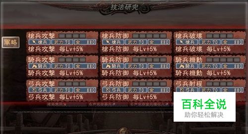 顾名思义,军略(战略)主要是针军事的技能研究,其中包括枪兵、骑兵、弓兵的攻击、防御、枪兵破坏能力、骑兵机动性、弓兵射程三个兵种的多个兵科的研究方向。
