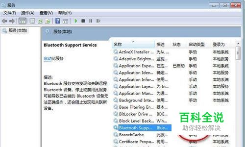 在弹出的服务窗口中找到Bluetooth Support Service服务,设置启动类型为自动,并启动服务,问题解决。