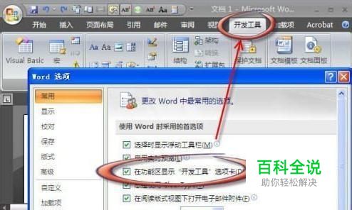 ①建立文档 在编写采购合同时候,按照正常的步骤输入文档,需要注意的是留出需要单独填写的部分。在下面的步骤中,我们将最常用的文本输入格式——文本,日期,下拉列表,复选框等内容来介绍给大家。 还有一点要注意,那就是要为Word添加“开发工具”选项卡,这是我们实现后期添加窗体控件的必要条件。在初始状态下,在菜单栏中是没有“开发工具”这个选项的。这时候,可以单击office图标(Office系列软件左上角),然后选择“Word选项”,在“常用”标签中选择“在功能区显示”开发工具”选项卡”,就可以看到了。