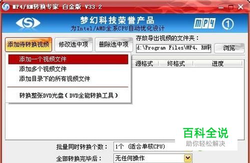 在《MP4/RM转换专家》中导入要调声音的视频 在软件主界面左上角点击“添加待转换视频”按钮,在弹出的文件选择框导入要调大声音的视频