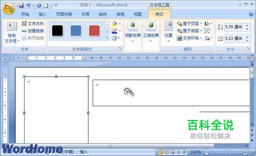 第1步,打开Word2007文档窗口,并插入多个文本框。调整文本框的位置和尺寸,并单击选中第1个文框。