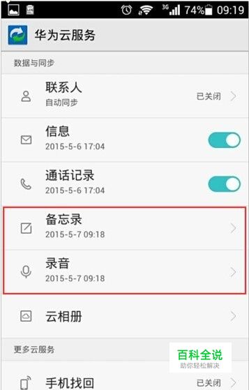首先进入手机设置里的华为云服务,除了联系人,信息和通话记录直接选择打开即可进行同步,备忘录、录音需要点击进入下一个页面进行选择。