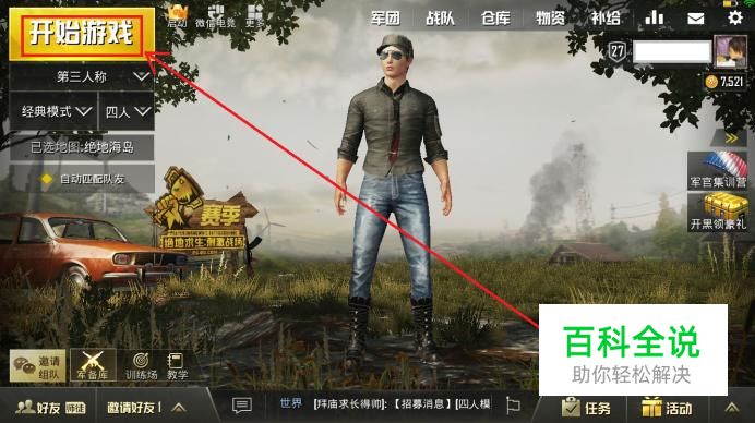 打开刺激战场,进入游戏大厅后, 点击屏幕左上角的“开始游戏”。