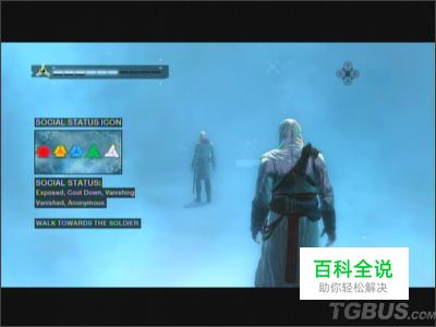 方向键为选择武器,按上为选择袖刀,是暗杀专用的武器。在敌人未警觉的情况下使用可一击必杀,按住RT键的话除了动作不同外效果是相同的。杀死守卫的话敌人发现尸体会进入警觉状态,上方的指示灯会变红。这时必须尽快逃离敌人视野使指示灯变成黄色,然后利用特有的环境地点才可消除警戒状态,指示灯变绿即表示安全。