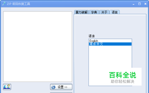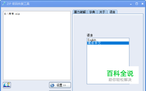 它是一款专业破解ZIP压缩包加密密码的密码破译工具,支持自选Dict字典第一次使用的时候请注意在Setting里选择一下语言文件。