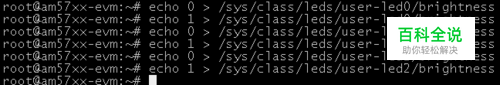 (2)逐个点亮对应LED,执行如下命令: Target# echo 0 > /sys/class/leds/user-led0/brightness //控制LED1灭 Target# echo 1 > /sys/class/leds/user-led0/brightness //控制LED1亮 Target# echo 0 > /sys/class/leds/user-led1/brightness //控制LED2灭 Target# echo 1 > /sys/class/leds/user-led1/brightness //控制LED2亮 Target# echo 0 > /sys/class/leds/user-led2/brightness //控制LED3灭 Target# echo 1 > /sys/class/leds/user-led2/brightness //控制LED3亮