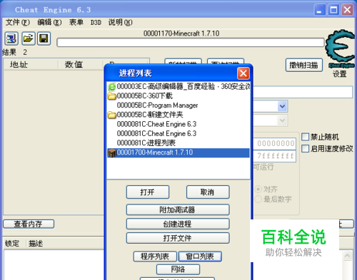 点击CE的打开文件,打开程序,点击窗口列表,选择游戏进程