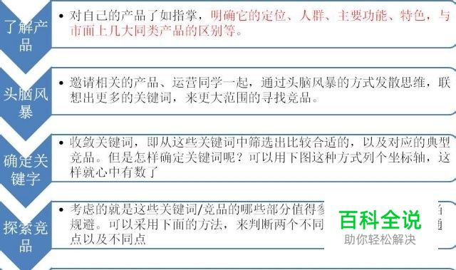 ① 选择分析目标:明确竞品分析的重点和需要解决的问题;选择合适的竞品(业务相同或者相关的产品) ② 对比和分析:按照若干维度(产品功能、交互设计、运营策略等)对产品和竞品进行逐项罗列对比和分析优劣 ③ 讨论和提出解决思路:根据第一步的确立的分析重点和第二步相关维度的对比进行综合讨论分析,进一步可结合时下的行业发展趋势,提出符合逻辑的解决方案思路。