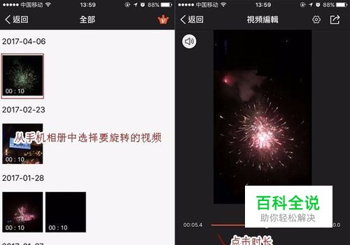 进入时长片段编辑界面中,视频是倒过来的,视频中的烟花在画面底部,那么在裁剪、分割、快慢、视频倒放、缩放、复制、旋转这些功能中,点击“旋转”,可以点击旋转几次,就可以把倒过来的视频旋转回来。还可以调整视频的音量。