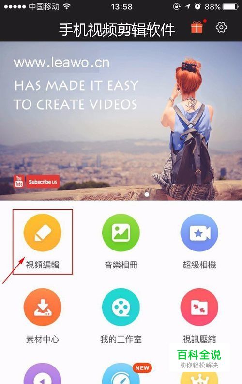 用的是苹果手机来操作。打开软件后,在软件主界面中,点击“视频编辑”按钮,如下图所示: