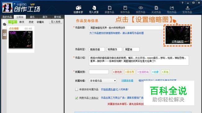 现在就和大家分享拍大师发布视频时设置视频封面的小技巧,让作品看起来更加与众不同,提升作品人气。 空间视频展示: 第1步:如下图1,用拍大师创作好视频上传分享时将会出现【作品发布信息】的编辑界面,点击【设置缩略图】开始设置视频封面。 第2步:如下图2,点击【设置缩略图】后,可以在系统自动生成的作品缩略图中选择一幅喜欢的截图,点击后的图片将在【当前缩略图】下方的窗口显示,如果对系统截图还不够满意,可以点击右下方的【手动截图】继续操作。 第3步:如下图3,在视频预览窗点击播放,播放到喜欢的画面时点击【截图】,截图完毕后将在【当前缩略图】下方窗口显示,满意点击【确定】。不满意可以继续播放视频点击截图。 第4步:如下图4,手动截图完成后,将返回缩略图主页面,如选择的缩略图满意可点击【确定】完成视频封面的设置。 如果你也觉得拍大师的这个功能不错,记得转发和好友分享哦!