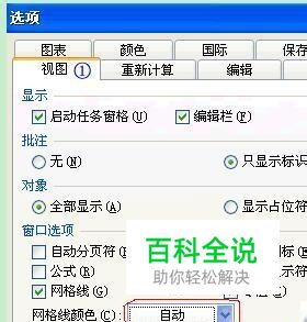 在上图中,切换到“视图”选项卡。 然后,在下面找到“网格线颜色”,使用鼠标左键点击其右方的下拉组合框选择颜色即可。最后点击“确定”按钮退出,就生效了。