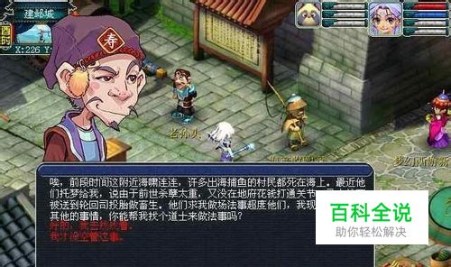 剧情简介:故事发生在风景秀丽的建邺小城,你在城中闲逛的时候遇到了愁眉苦脸的老孙头,询问之后得知老人的心事,于是你答应帮他找法师超度死去的渔民。 任务涉及的人物:老孙头、牛大胆、王大嫂、管家、马全有、李善人、商人的鬼魂。