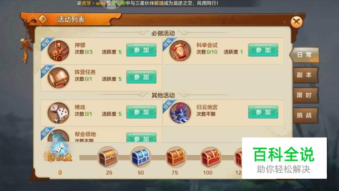 进入副本界面,在其他活动中即可看到剧情副本,点击“参加”,每日可参与1次,参与后获得10点活跃度。