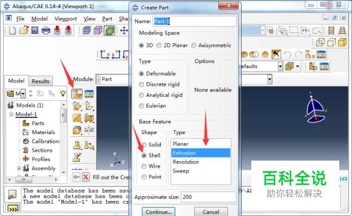 点击新建part图标,在基本属性位置选择part的类型为shell,建立的方法选择extrusion