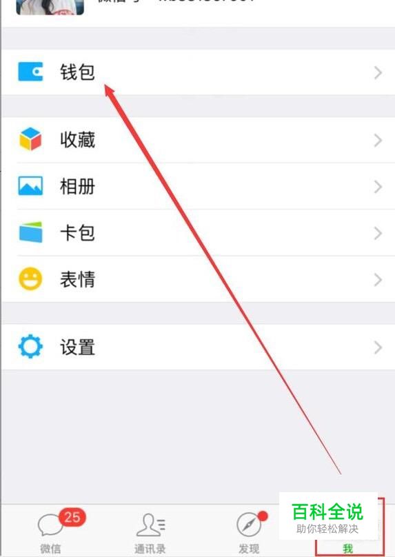 进入微信App聊天页面,点击右下角的“我”进入下一个页面,点击进入“钱包”按钮。