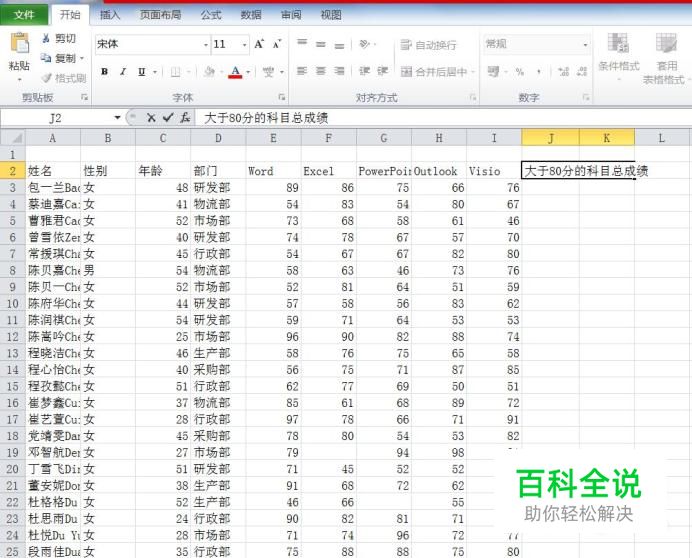 将鼠标移到单元格的右下方双击,填充出所有学生的大于80分科目的总成绩。