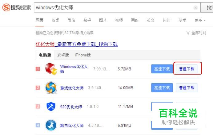 在搜狗搜索中输入关键词“windows优化大师”