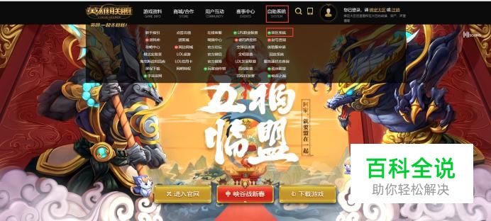 首先,登录英雄联盟官方网站http://lol.qq.com/,点击图中所示位置来到专区系统页面。