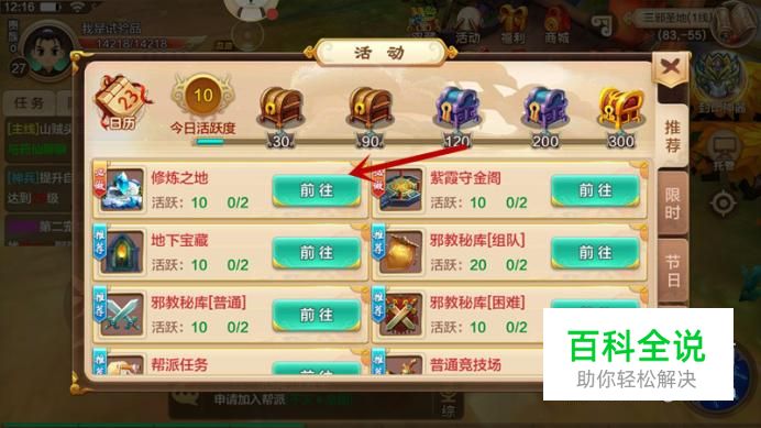 进入活动界面,点击“修炼之地”前往,每日可参加2次,完成后获得10点活跃度。