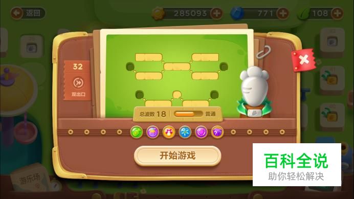 首先观察这关的基本情况,这是一个双出口关卡,路程比较短,而且总共有十八波怪物,可见这关难度不小。再看提供给我们的炮塔,有瓶子炮,毒气瓶,蘑菇炮塔,冰冻花,魔法球和神秘炮塔。这些炮塔的攻击力都不是很强,在关卡比较难的情况下,小编果断选择了好友助力。
