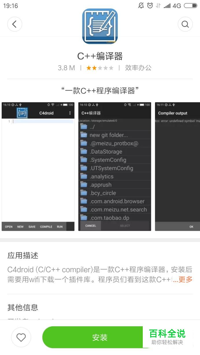 首先,我们在手机的应用商店搜索“C4droid”,然后下载如图“c++编译器”。