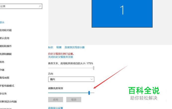 进入显示设置后,鼠标往下拉,找到下面调整亮度级别,拉动上面的横条就可以调节亮度了。