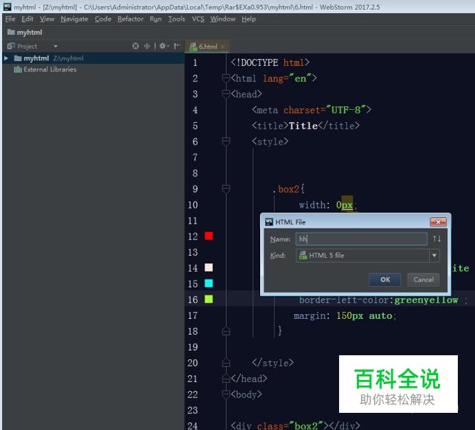 在编辑环境(webstorm)里面新建一个名为hh的html文件