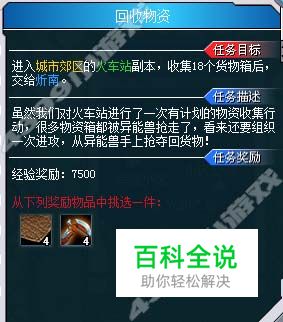 在城市郊区的火车站副本,收集18个货物箱后,出来回去交给炘南,完成任务并获得奖励。