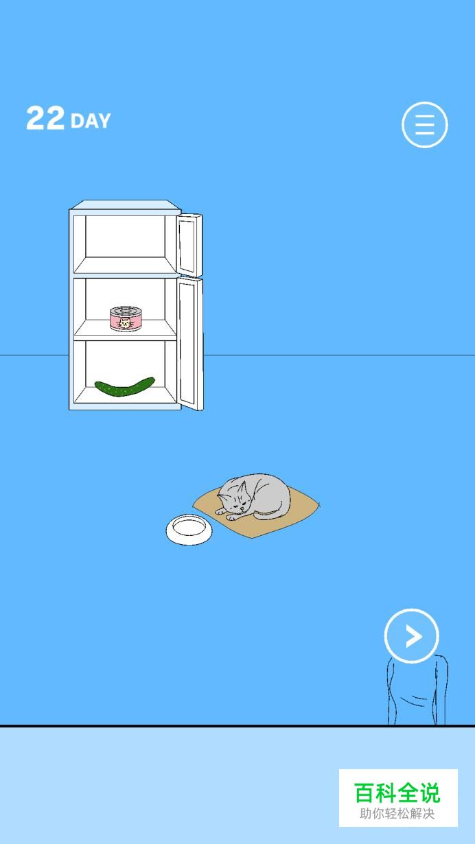 第二十二关:我们先要打开第一个房间内的冰箱,将猫粮罐头和黄瓜放入物品栏,然后再将猫粮罐头拖到猫咪的食盆内,等猫咪吃罐头时,把黄瓜放在猫咪身后,这样猫咪就会离开坐垫,我们就可以拿到坐垫下面的游戏机了。