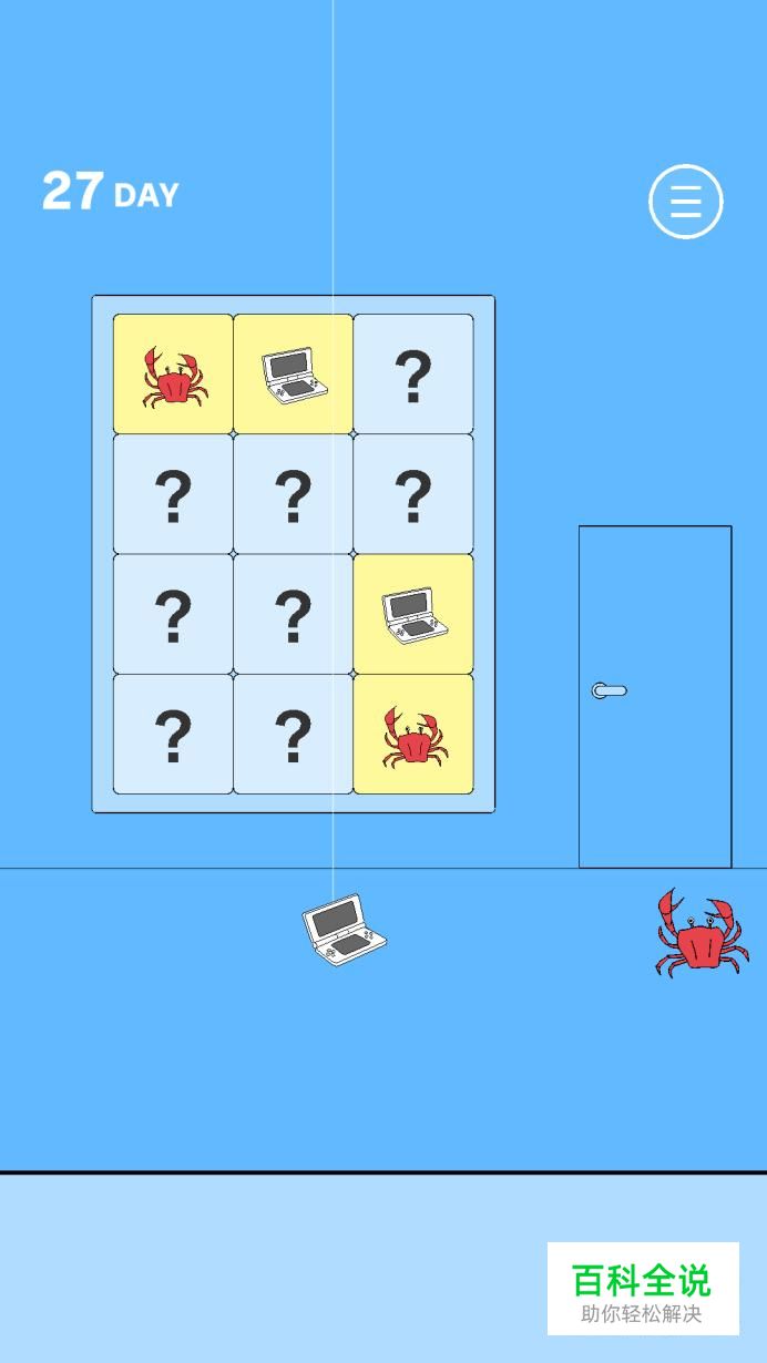 第二十七关:这一关算是一个翻牌小游戏,我们先要点击墙面上的问号牌,找到两张一样的游戏机纸牌,然后等游戏机掉下来时,再翻出来两张一样的螃蟹纸牌,这时就会爬过来一只螃蟹,点击螃蟹将其收入物品栏后,再利用它剪掉游戏机上面的绳子,这样就可以拿到游戏机了。