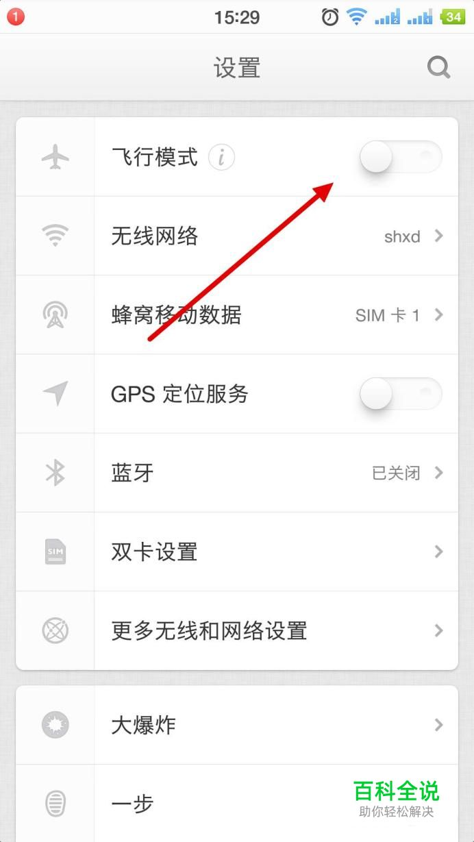 我们点击进入设置界面后,我们会看到有一个“飞行模式”开关。