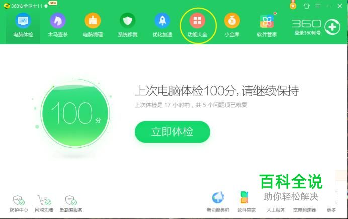 打开“360安全卫士”后,在主界面上侧点击“功能大全”。