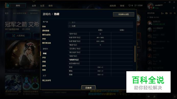 在设置页面中,选择“热键”设置,在设置页面的右上角,点击“恢复默认设置”,让英雄联盟的按键都恢复为系统设置。