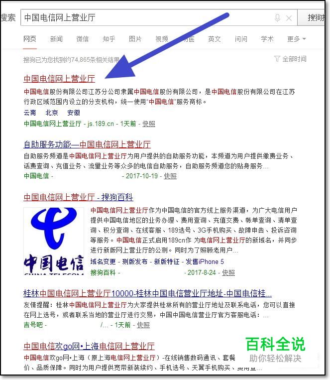 首先我们使用浏览器搜索中国电信网上营业厅,然后打开中国电信网上营业厅的官网。