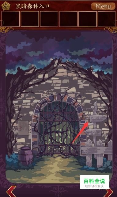 最后一步,拿着剪刀到黑暗深林入口把铁门上的荆棘剪断就通过这一关了。