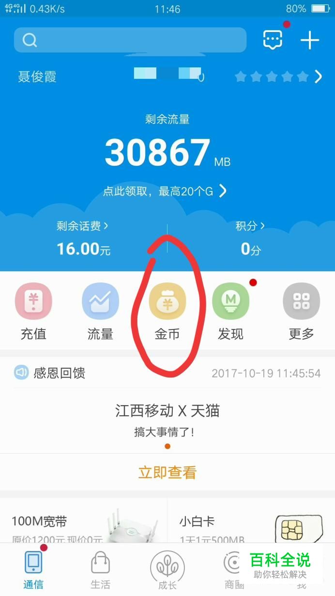 如图,锦囊里的金币就收到了自己的账户里,金币经过兑换,就可以变成流量,一个金币能兑换一兆流量
