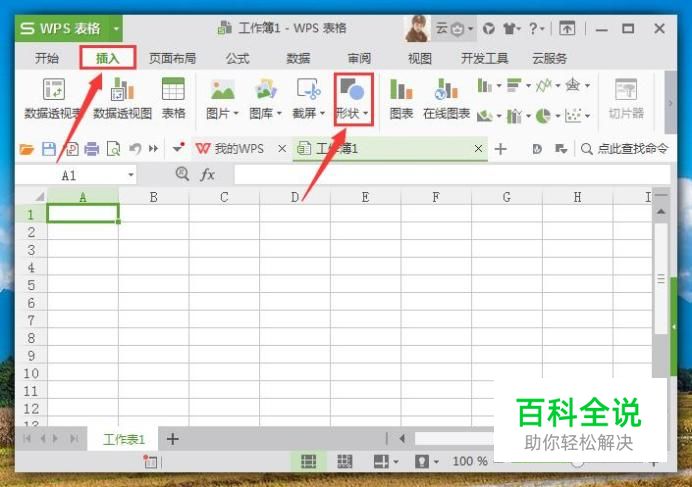 进入表格主界面后,在上方菜单栏中选择“插入”,然后在其子菜单中选择“形状”工具,如图所示:
