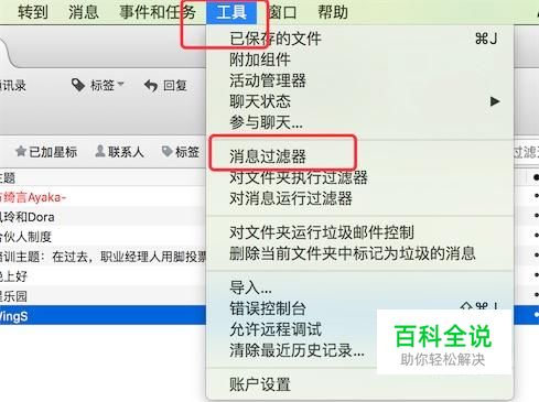 点击菜单栏上的‘工具’,然后点击下拉菜单的‘消息过滤器’。