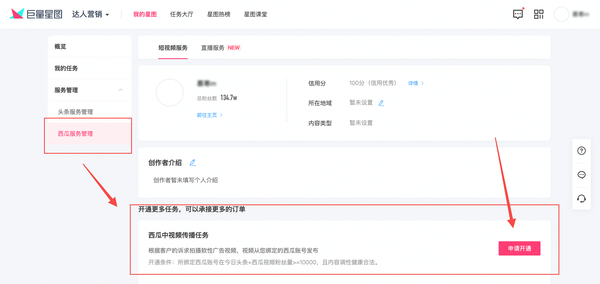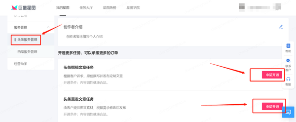 在「我的星图」大厅,点击「服务管理」→「头条服务管理」,分别点击「申请开通」「头条撰稿文章任务」、「头条直发文章任务」、「微头条撰稿任务」和「问答撰稿任务」。