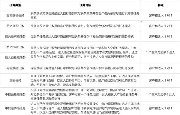 目前,星图头条和星图西瓜共支持 9 种任务,具体如下: